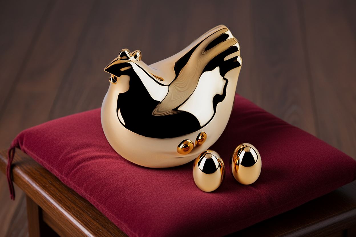以台灣民間金雞招財傳說為基礎,作品採鋁合金鑄造,造型圓潤討喜。元寶雞冠、高翹尾巴象徵財富與子孫滿堂,是結合工藝與吉祥意涵的文創擺飾,深具收藏價值。