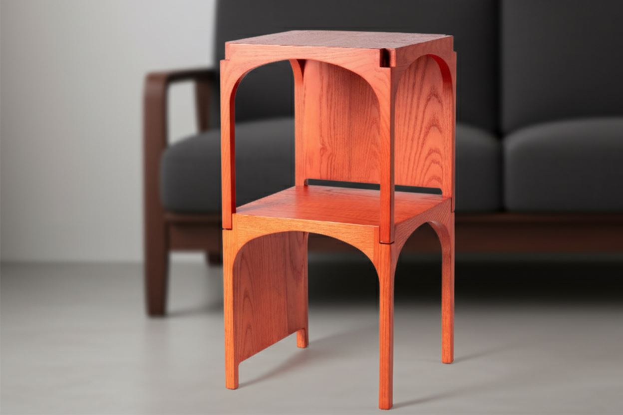 靈感來自彰化街屋與老聚落,透過模組化實木設計打造可堆疊組合的家具層架。作品如同城市地景縮影,展現建築錯落之美,結構穩固且富創意,為生活空間注入文化氣息。