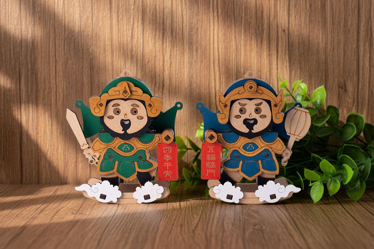 結合傳統門神造型與現代搖搖馬意象,門神手持法器與祝賀詞,象徵四季平安、五福臨門。作品不僅保有民俗信仰意涵,也兼具童趣與實用性,是創新與文化的巧妙融合。